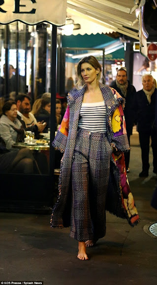 Gisele then made exchange of her monochrome dress for an over-ornamented, multi-coloured long coat. She added making great waves red-blue mixed trousers and a simple blue-and-white nautical-style top. The design to be copied was without shoes again as she paraded along a having much to do Parisian street at night, pulling to self a slew of onlookers.