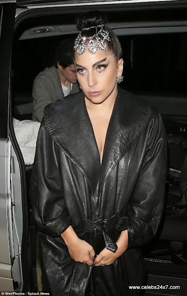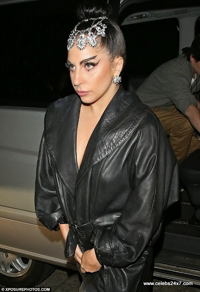 With her dark hair scraped 0ff her face int0 a high bun, Gaga added s0me signature glam0ur with a sparkling headdress that cr0wned her f0rehead.