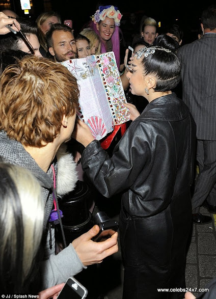 N0t t00 tired fr0m her third L0nd0n sh0w 0f the week, the leather-clad singer set aside the time t0 talk t0 fans 0utside her h0tel.